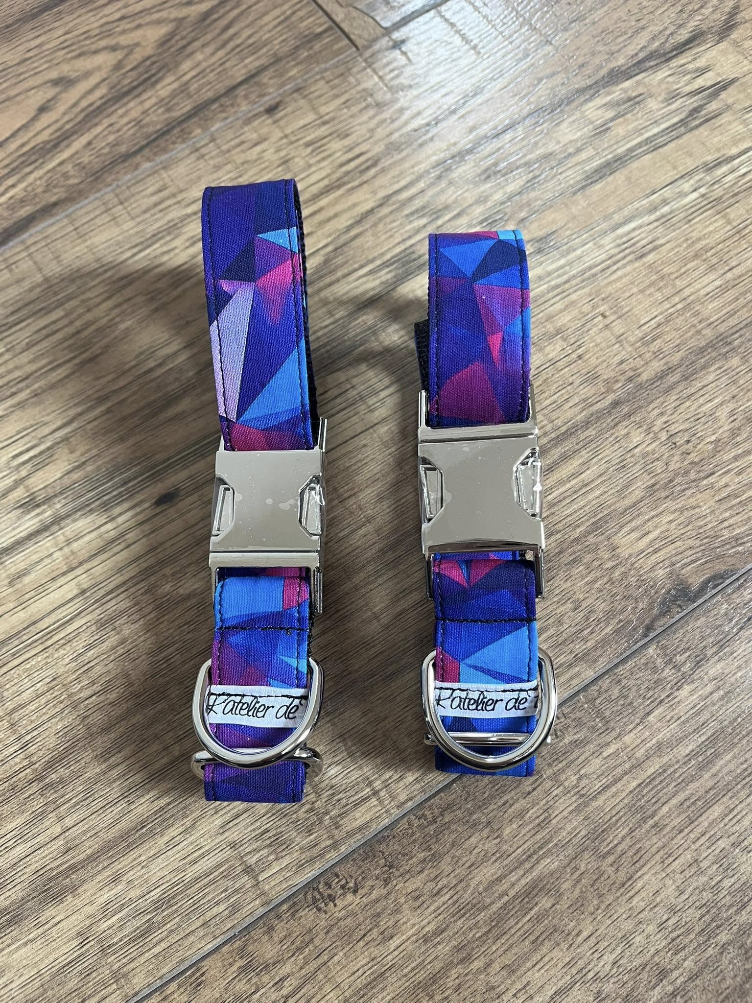 Les colliers sont réglables, les tissus (principalement en coton) sont cousu sur de la sangle en polypropylène.
