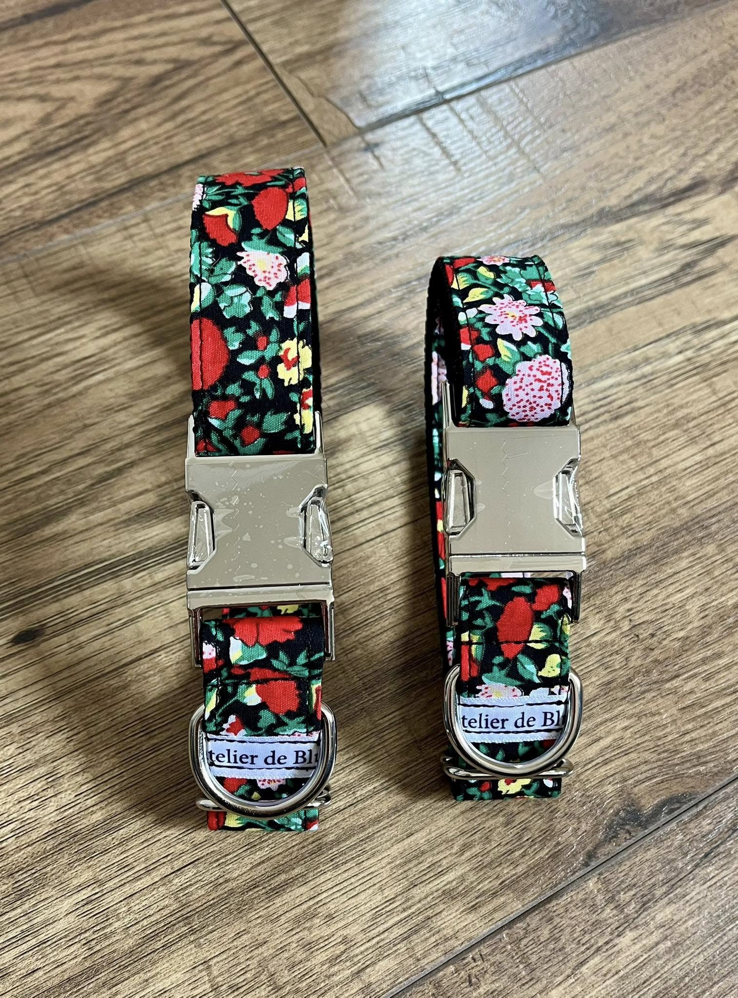 Les colliers sont réglables, les tissus (principalement en coton) sont cousu sur de la sangle en polypropylène.