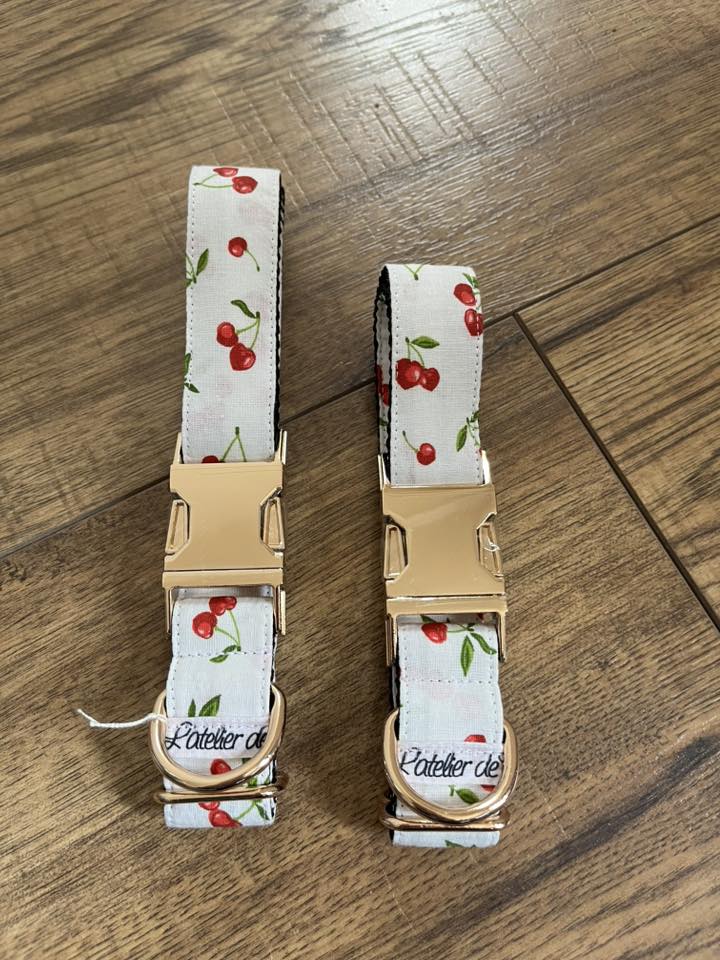 Les colliers sont réglables, les tissus (principalement en coton) sont cousu sur de la sangle en polypropylène.
